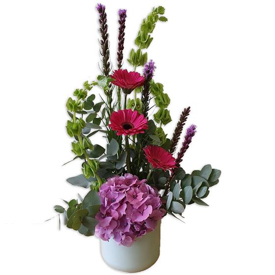 Design includes gerbera daisies, hydrangea, textured vertical stems, eucalyptus and fresh green foliage, arranged into a modern, upright display with clean lines, natural movement and a calm, architectural finish.