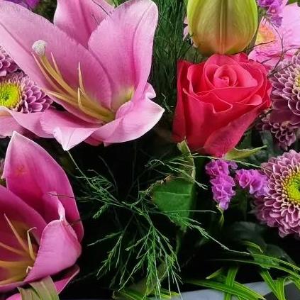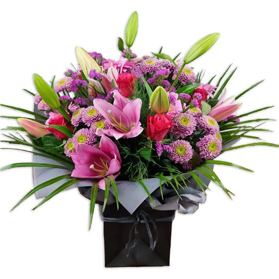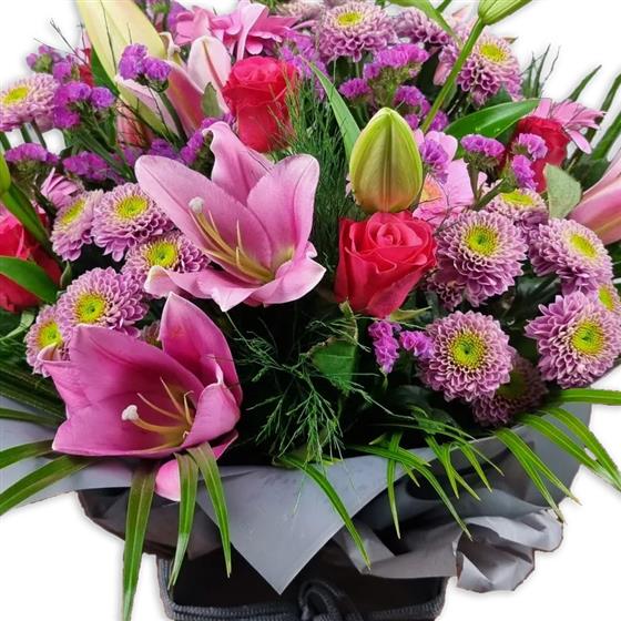 Brighten any space with pink Oriental lilies, hot-pink spray roses, lilac button chrysanthemums, delicate statice and feathery greenery, an elegant arrangement bursting with colour and charm.