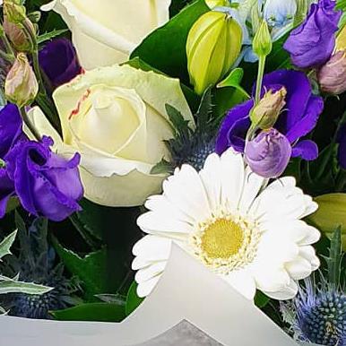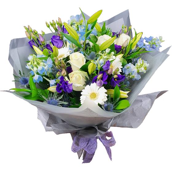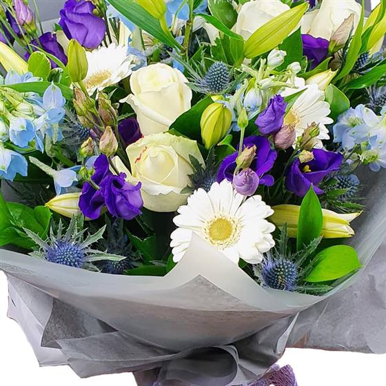 A gentle mixed flower bouquet featuring cream roses, white gerberas, blue delphinium, purple lisianthus, closed lily buds and textured thistle, arranged with fresh green foliage for a calm, elegant finish.