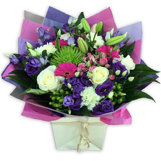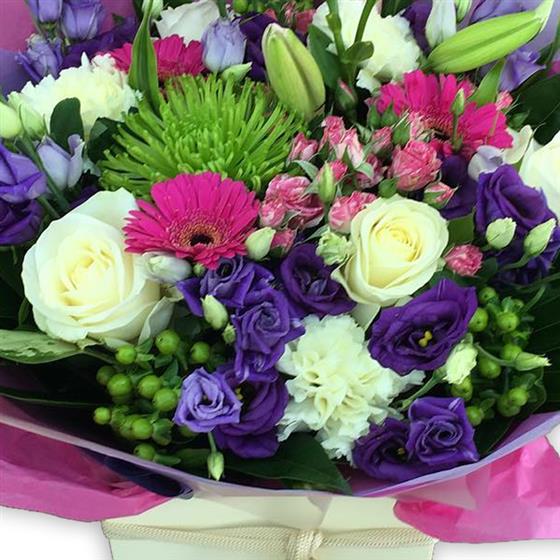 This joyful bouquet features unopened Oriental lilies, creamy white roses, violet lisianthus, bright pink gerberas, green spider chrysanthemums, alabaster carnations and delicate hypericum berries nestled in verdant foliage.