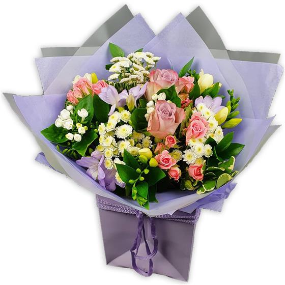 Blush garden roses paired with pale spray roses, white button mums, golden freesias and lavender freesia, all cradled by lush greenery for an elegant, whisper-soft bouquet.