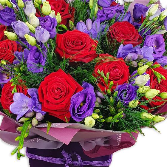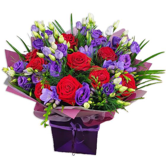 Brighten any space with rich red roses nestled among soft purple lisianthus, delicate freesia buds and textured seasonal greenery, creating a striking bouquet full of depth, contrast and elegant colour.