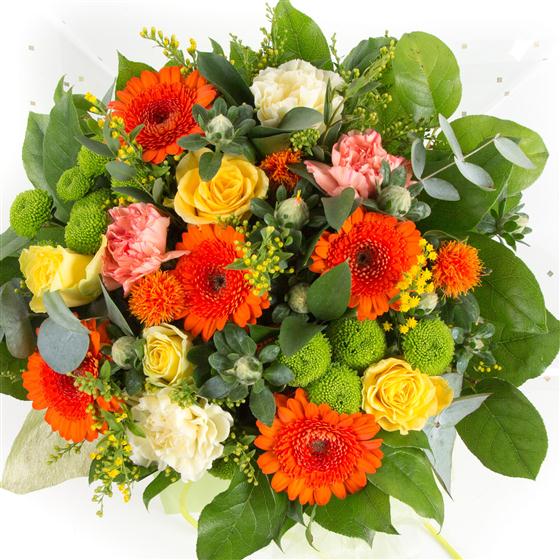 Gerberas, roses, carnations, carthamus and solidaster combine to make an explosion of colour.