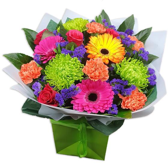 Design includes bright pink and orange gerbera, red roses, peach carnations, green chrysanthemum blooms, purple statice and glossy green foliage, arranged into a bold, cheerful bouquet bursting with colour, texture and playful energy.