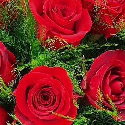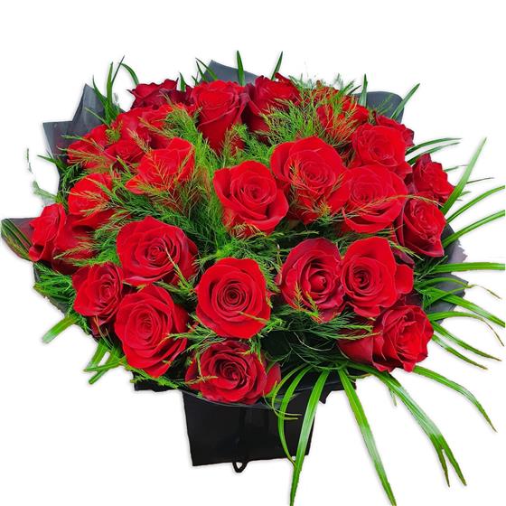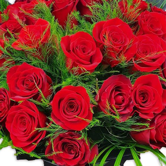 A striking flower arrangement made using premium red roses, arranged en masse and finished with soft green foliage for contrast and depth. Timeless, confident and designed to make a powerful visual impact.