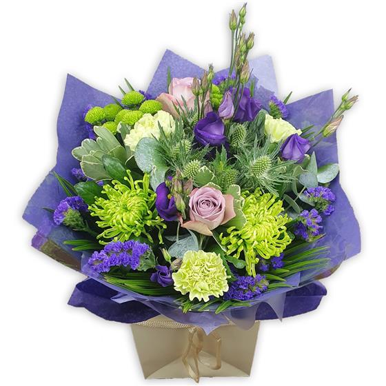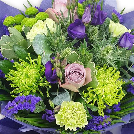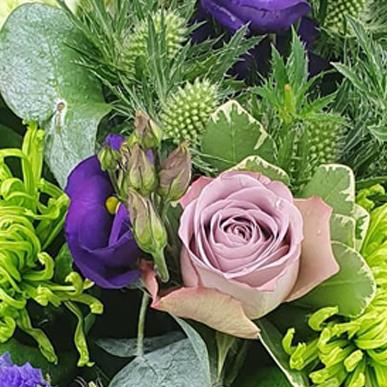 Enchanting bouquet featuring lavender roses, chartreuse spider chrysanthemums, pistachio carnations, delicate purple lisianthus, violet statice, silver eryngium and eucalyptus, beautifully accented with lush greenery and elegant wrap, opulent presentation.