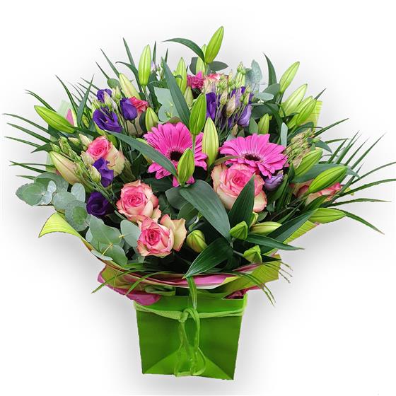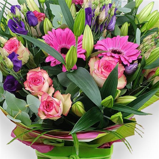 Design includes pink germini, soft pink roses, unopened lily buds, purple lisianthus, eucalyptus and flowing green foliage, arranged into a lively, textured bouquet with height, freshness and a clean, modern feel full of natural movement.