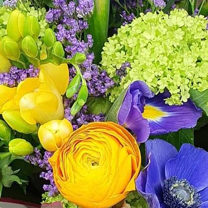 Design includes yellow ranunculus-style blooms, blue anemone-style flowers, viburnum, freesia buds, soft purple seasonal detail and fresh foliage, arranged into a lively spring bouquet with movement, texture and clean colour contrast.