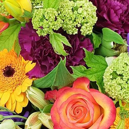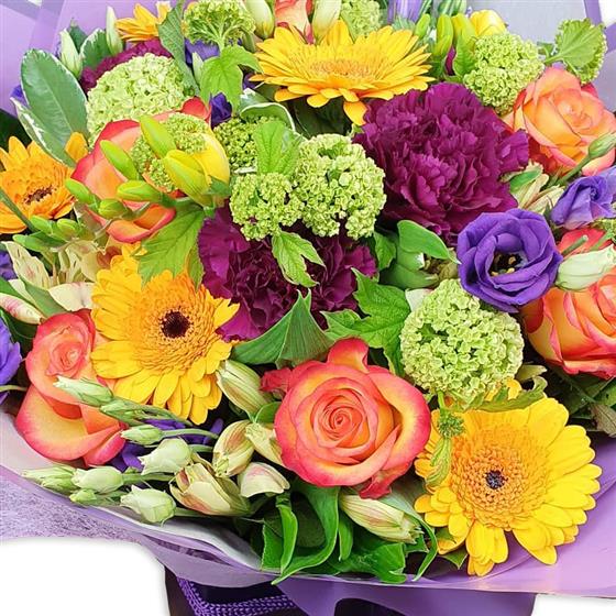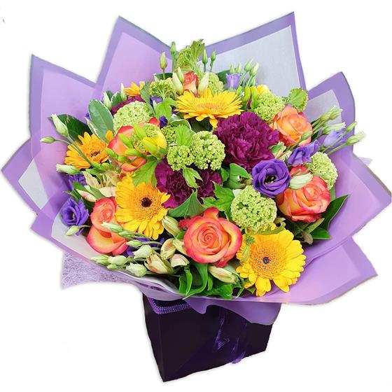A fresh, uplifting flower bouquet mixing soft creams, sunny yellows and rich purple tones. Arranged with roses, gerberas, chrysanthemums and lisianthus for texture, colour contrast and long vase life. Bright, balanced and easy to enjoy.