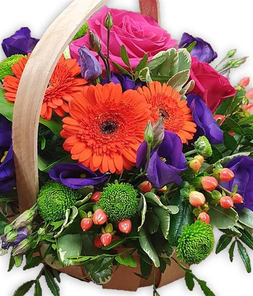Vibrant hot-pink roses and fiery orange gerberas nestle beside purple lisianthus, green button chrysanthemums and coral hypericum berries in a rustic basket, framed by lush variegated foliage.