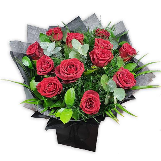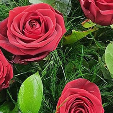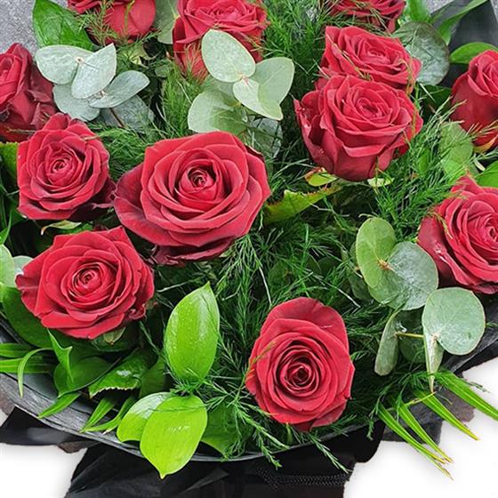 Soft crimson roses accentuated by feathery asparagus fern and tender eucalyptus, tied with paper wrap for whisper-soft luxury.