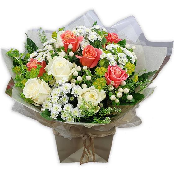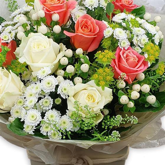 Lovely arrangement of fragrant creamy white roses, coral roses, pure white spray chrysanthemums, hypericum berries, and green alchemilla, nestled in lush foliage—wrapped in elegant paper for timeless, refined charm.