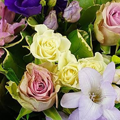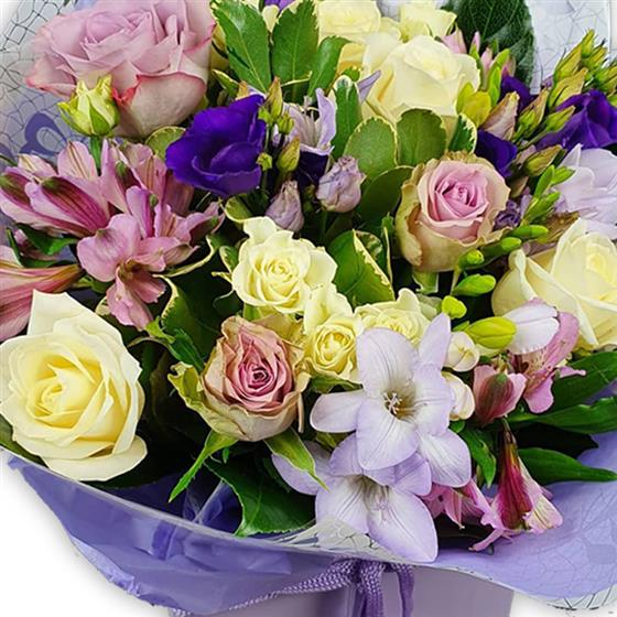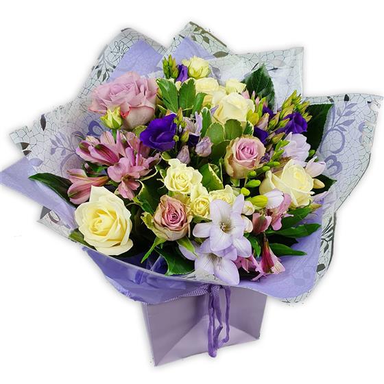 Delicate bouquet of blush garden roses, ivory roses, purple lisianthus, pink alstroemeria and lush green foliage, elegantly wrapped in paper, perfect soft timeless elegance.
