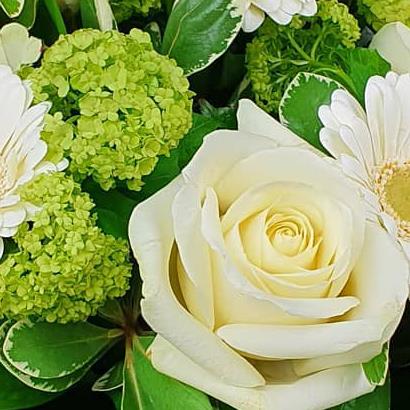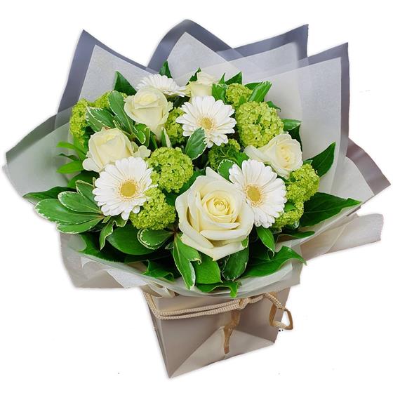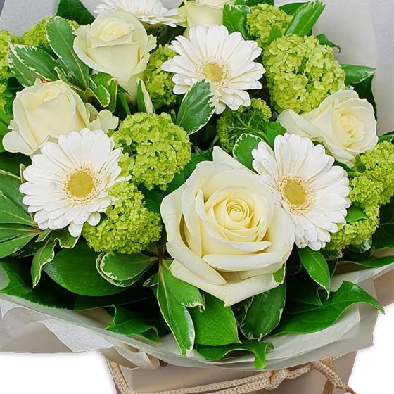 A fresh flower arrangement featuring white roses, gerbera, viburnum and glossy seasonal foliage. Clean white blooms are paired with soft green texture to create a crisp, modern design with a calm, natural finish.