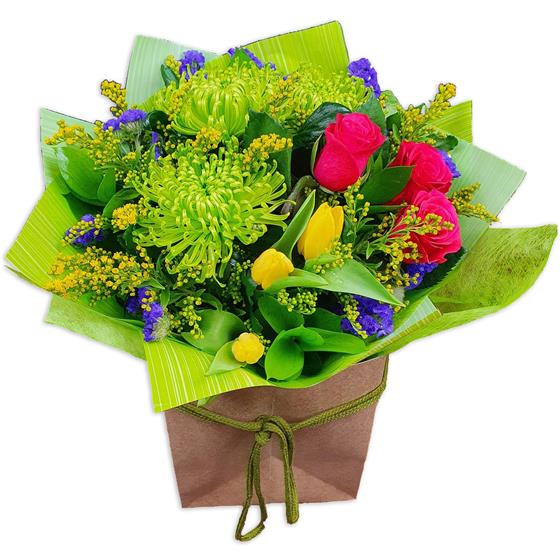 Design includes vibrant green chrysanthemums, roses, tulips, delicate yellow filler flowers and pops of purple seasonal detail, brought together with fresh foliage for a crisp, uplifting bouquet full of energy and colour balance.