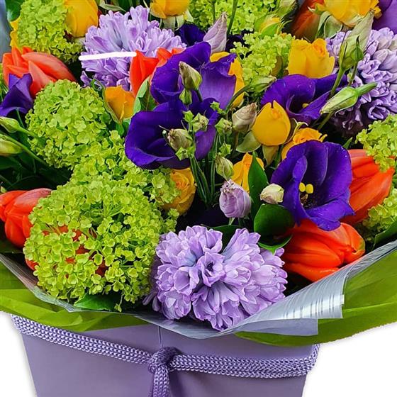 Design includes green viburnum-style blooms, lisianthus, tulips, roses and layered seasonal flowers in strong contrasting tones, arranged into a lively bouquet with depth, texture and a confident, modern feel.