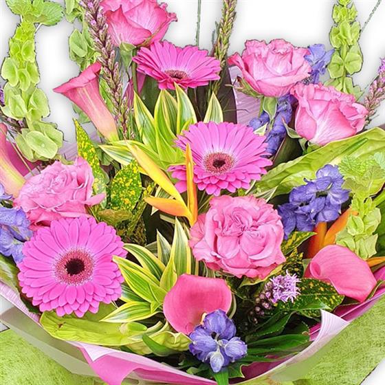 Whisper-soft pink gerberas and pastel roses mingle with calla lilies, delicate lisianthus and liatris spikes, accented by cheerful green bells-of-Ireland and a tropical bird-of-paradise.