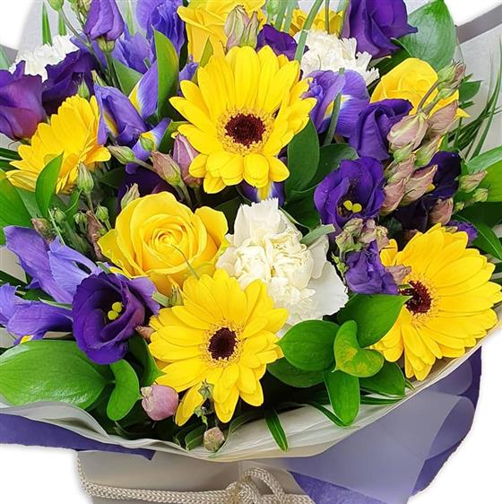 Design includes gerbera daisies, roses, lisianthus, soft white blooms and fresh green foliage, arranged into a lively bouquet with bold contrast, balanced structure and a bright, uplifting finish.