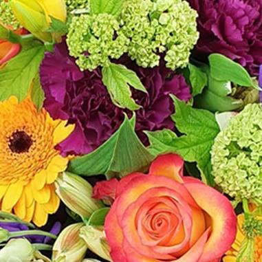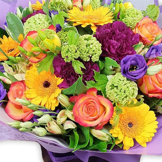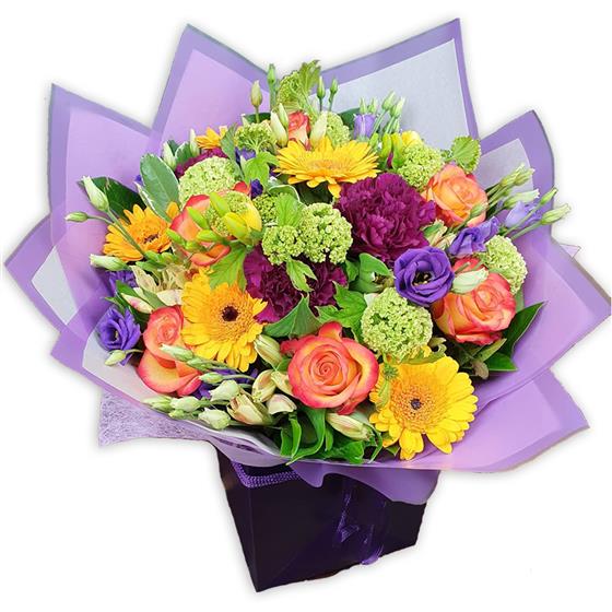 Radiant bouquet bursting with summer colour, featuring golden gerberas, coral bicolour roses, burgundy carnations, purple lisianthus, lime viburnum and creamy alstroemeria, nestled in mint foliage and wrapped in paper.