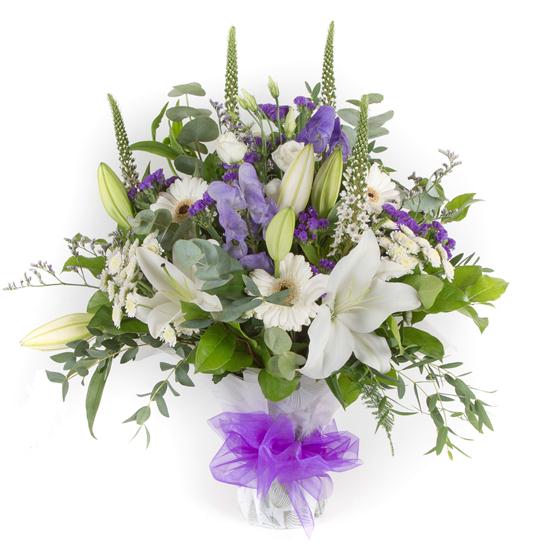 An elegant bouquet of white and purple blooms including scented oriental lilies, statice, limonium and wispy foliage.