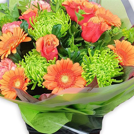 Soft orange roses, coral gerberas and green spider mums mingle with peach carnations and lush greenery for a warm, uplifting bouquet that brightens any space with gentle, sunlit charm.