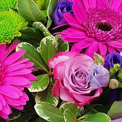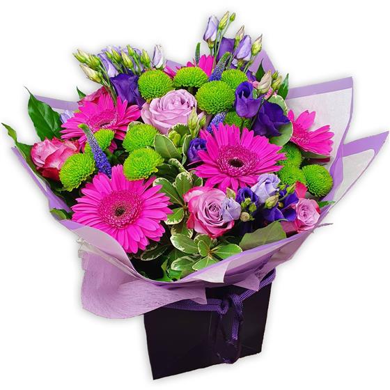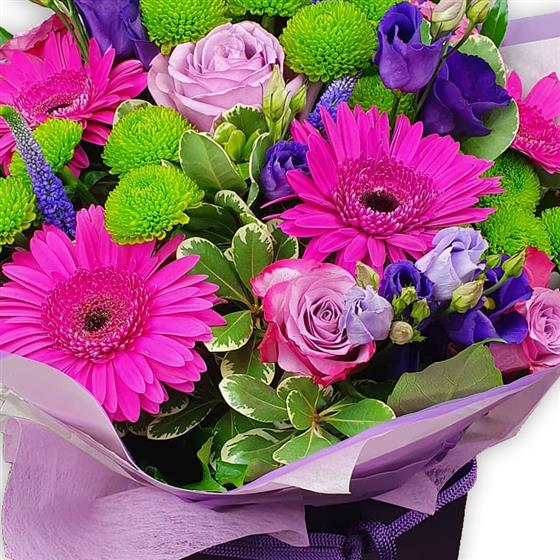 A whimsical arrangement of fuchsia gerberas, lavender spray roses, deep purple lisianthus and green button mums, tied together with graceful veronica and lush foliage in a gentle wrap.
