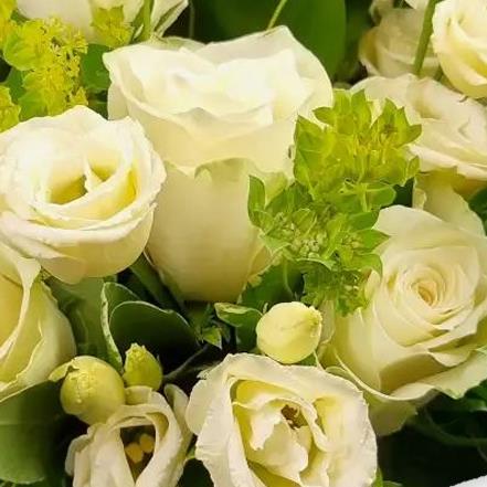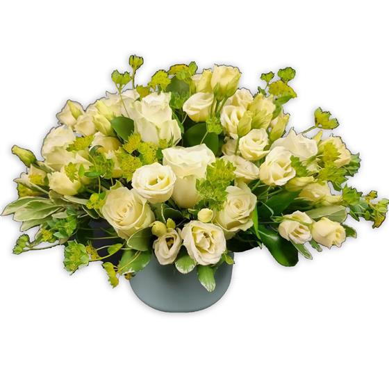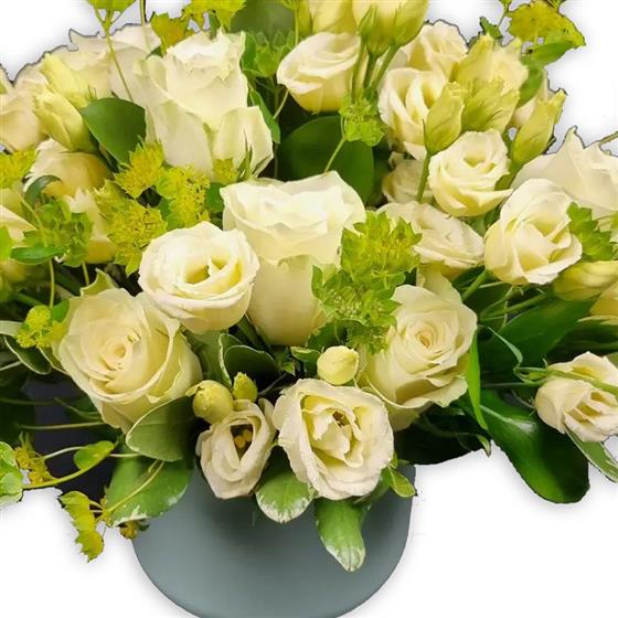 Ivory roses and creamy lisianthus nestle among chartreuse viburnum clusters and lush greenery for a whisper-soft arrangement that soothes with gentle, serene elegance.