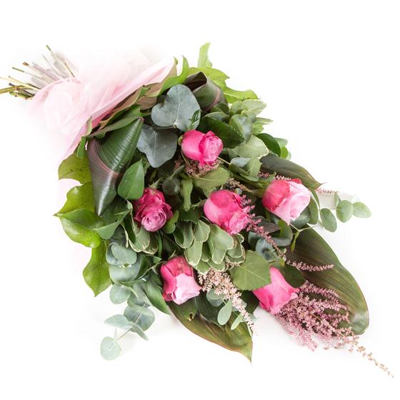A simple tied bouquet of 6 roses in your choice of pink, red, white or yellow. Choose either 6 roses as pictured or 12.