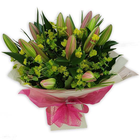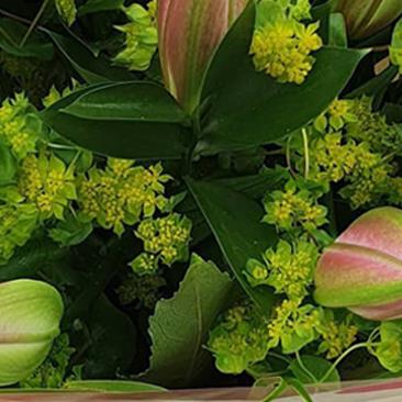 Tender pink lilies paired with soft chartreuse alchemilla and fresh foliage, wrapped in tissue for a delicate, soothing gesture.